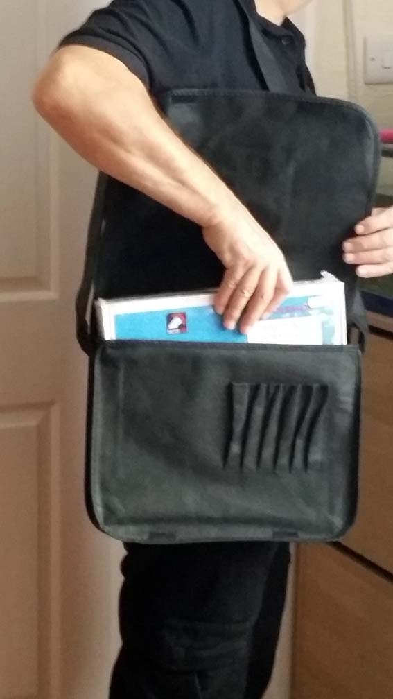 A lightweight, strong practical bag with a large main compartment, (36cm x27cm x 6cm) sections for pens and a shoulder strap with velcro flap, it’s plenty big enough to hold lots of goodies but not so large as to be a danger to all around you ever time you turn around!